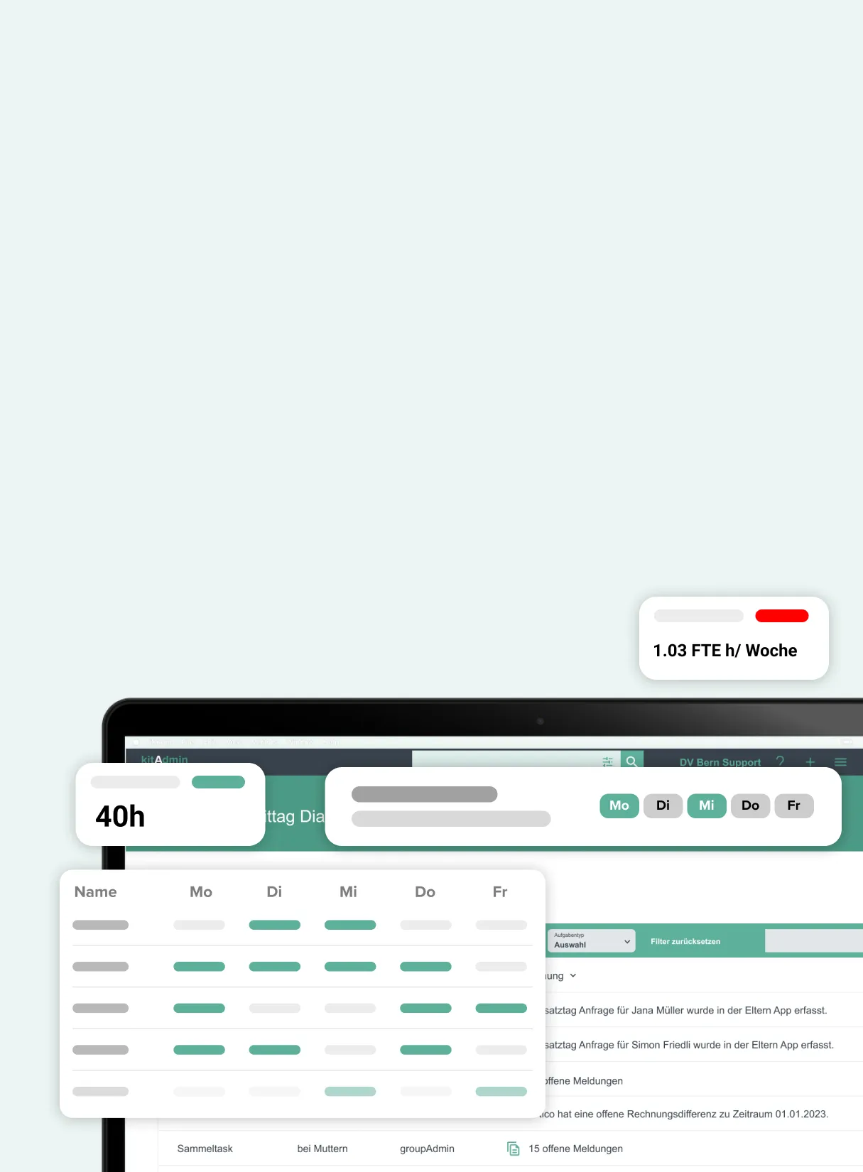 kitAdmin ist mehr als eine Software – Entwickelt von der DV Bern AG, entlastet kitAdmin mit digitalen Tools, die den Alltag in sämtlichen Betreuungseinrichtungen spürbar vereinfachen. Eine Herzenslösung für alle, die Betreuung mit Leidenschaft gestalten.